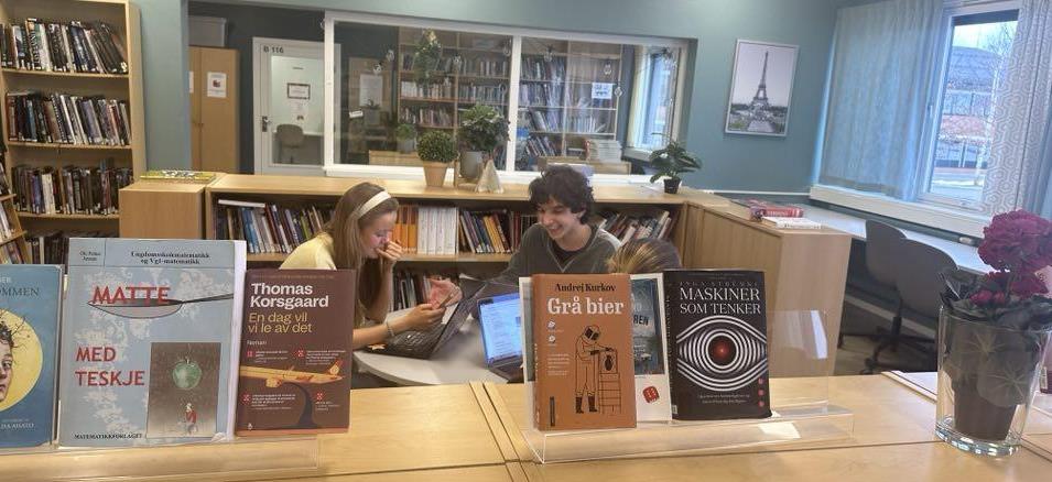 Du kan låne bøker med Pocket-ID (elektronisk elevkort). Når du skal levere kan du bare sette bøkene i innleveringshylla på biblioteket, så blir det registrert inn. Du trenger kun kortet ditt/Pocket ID når du skal låne. Vi har en stille-lesesal, ellers er det fint å jobbe alene eller i grupper i resten av biblioteket.